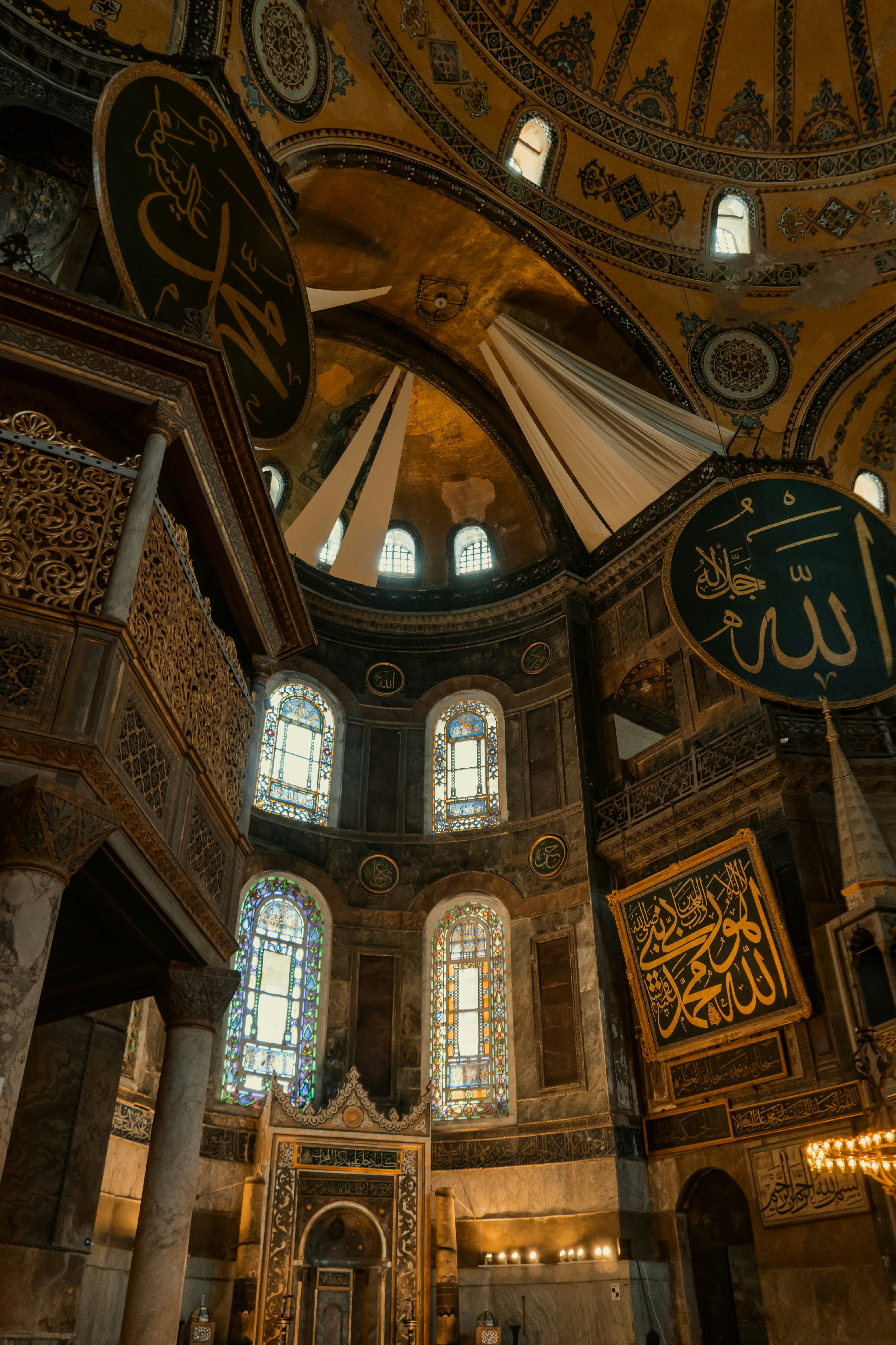 The interior of a mosque is beautifully decorated.